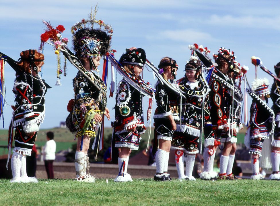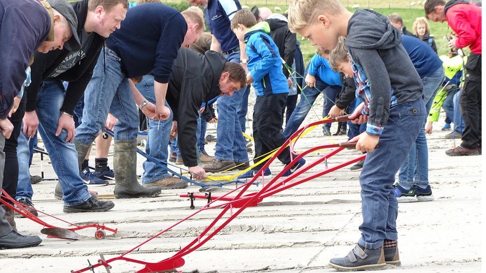 Children dress as horses with very elaborate outfits. Historically the costumes were worn by boys but more recently girls have taken part. The festival starts with a parade of the “horses” following which they proceed to a nearby beach for a Plooin’ (Ploughing) competition. Using miniature ploughs, the boys compete for the straightest furrow in the sand. The little ploughs have become family heirlooms and are passed down through the farming families.