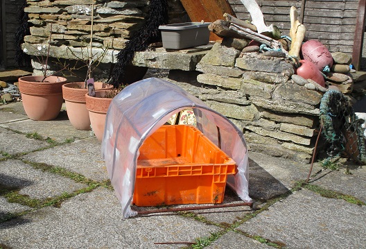 17th April – Over the past few weeks we’ve been beachcombing and collected bits and pieces of rubbish off the shore. I’ve put together an old plastic fish box and the metal frame from a crab pot and made this little cloche arrangement.