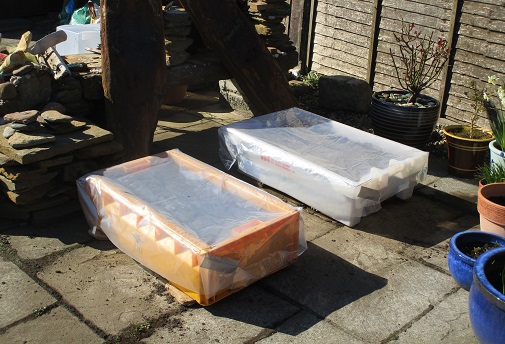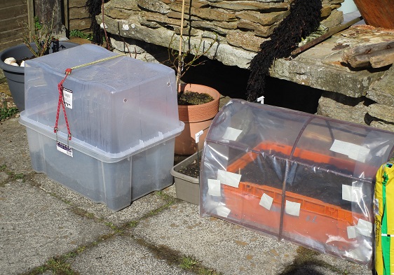 21st April – The good weather is continuing. We’ve filled another couple of old fish boxes and made a propagator out of two stationery boxes. H has made a couple of polythene covers to protect the bigger boxes.
