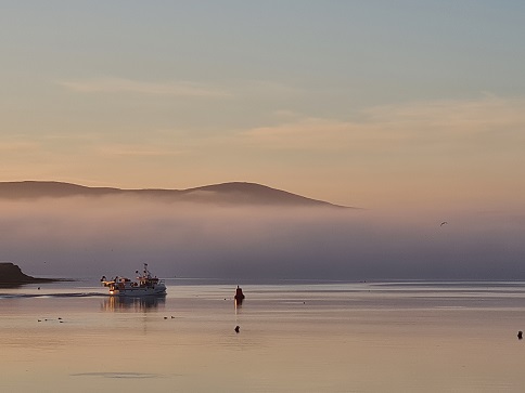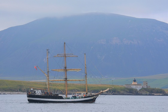 24th July – Having visited Stromness, the sail training vessel, Pelican of London, departs through Hoy Sound.