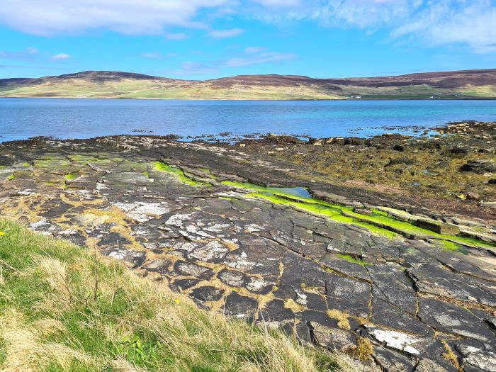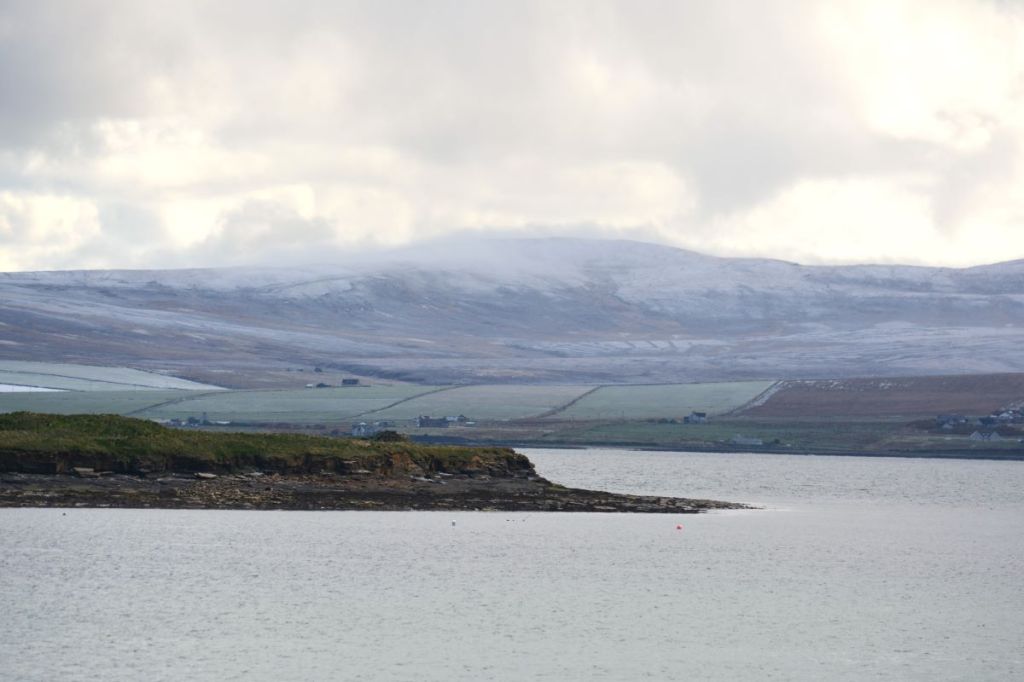 16th April – It was a nice day, so we thought we’d have a change of scenery. We drove over to Evie and the Broch of Gurness. This is one of the Shorewatch sites, so I managed a couple of watches. This is looking across Eynhallow Sound towards the island of Rousay. Known for its abundance of archeological sites, Rousay is often referred to as “the Egypt of the North”. The only difference being sheep instead of camels.