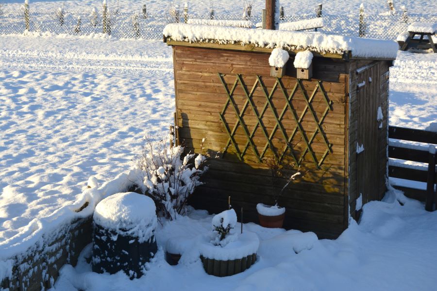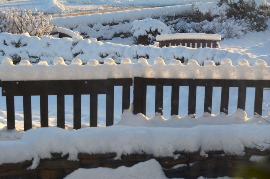 The bird boxes on the shed are now well insulated. It seems a shame to walk through the snow but the birds will have to be fed and watered. The lack of wind has produced some pretty effects with snow lying on a very thin fence, enhanced with the sun shining through it.
