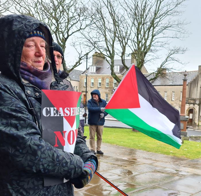 10th February – As the tragedy continues unabated in Gaza, we still maintain our vigils. Today was particularly cold and energy draining. Fellow Stromnessian, Jeannie, looks especially cold here.