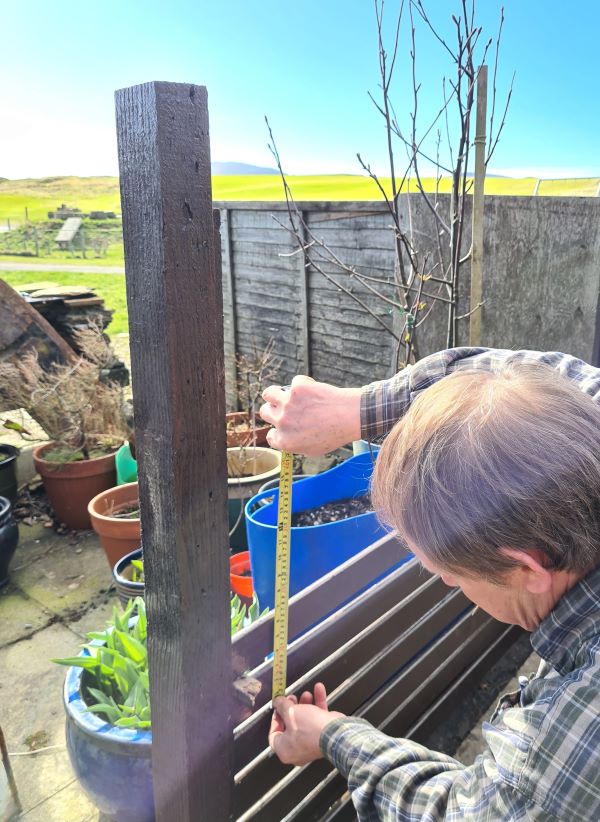 20th March – Our friend, Terry, has come over from Dounby, to lend a hand with upcycling an old bed frame. We lost a fence panel in a recent storm and decided to repurpose the wooden slats to make a fence that will slow the wind and hopefully give some protection to the plant pots.