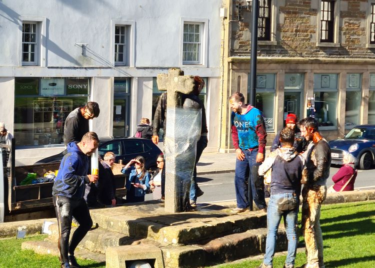 On a cheerier note, we were joined a group of lads taking part in an Orkney “blackening”, a ritual whereby an imminent groom-to-be is paraded around the town on the back of a truck and is publicly humiliated by his “friends” by being covered in treacle and other noxious substances. He is eventually cling-filmed to the Mercat Cross, in front of the Cathedral, and abandoned (for a peedie while).