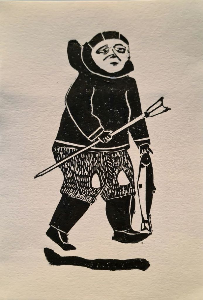 17th July – H has been working on her linocut technique today. This is an image of an Inuit hunter based on a stone cut image in Stromness Museum.