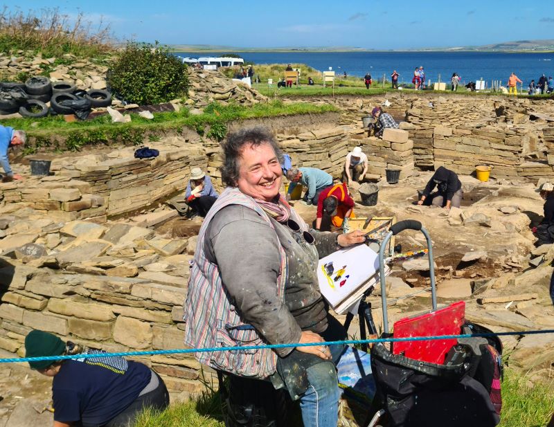 Of course, we couldn’t visit the Ness of Brodgar without bumping into Jeanne Rose, here she is in her element, painting the structures as they are uncovered.