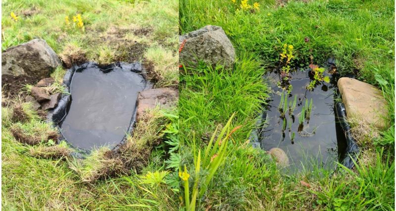 7th August – Last year I built a small pond, using a pre-formed plastic liner. Put some pond plants in and left it to overwinter. Despite an icy covering it came through and seems to have settled in nicely.
