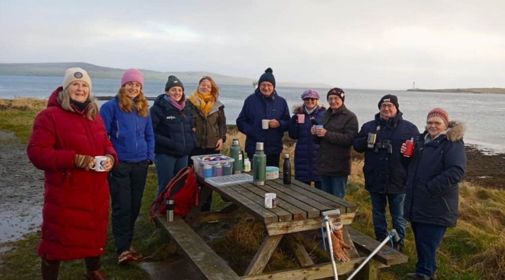 8th December – WDC co-ordinator for the Northern Isles, Emma Steel, is taking up a new job as the Senior Science Officer with the Hebridean Whale and Dolphin Trust, based on Mull. She set up Shorewatch in the Northern Isles four years ago and has recruited dozens of volunteers in that time. She organised a mulled wine and mince pie get together this afternoon for her Ness Point recruits and we were blessed with decent weather for it.