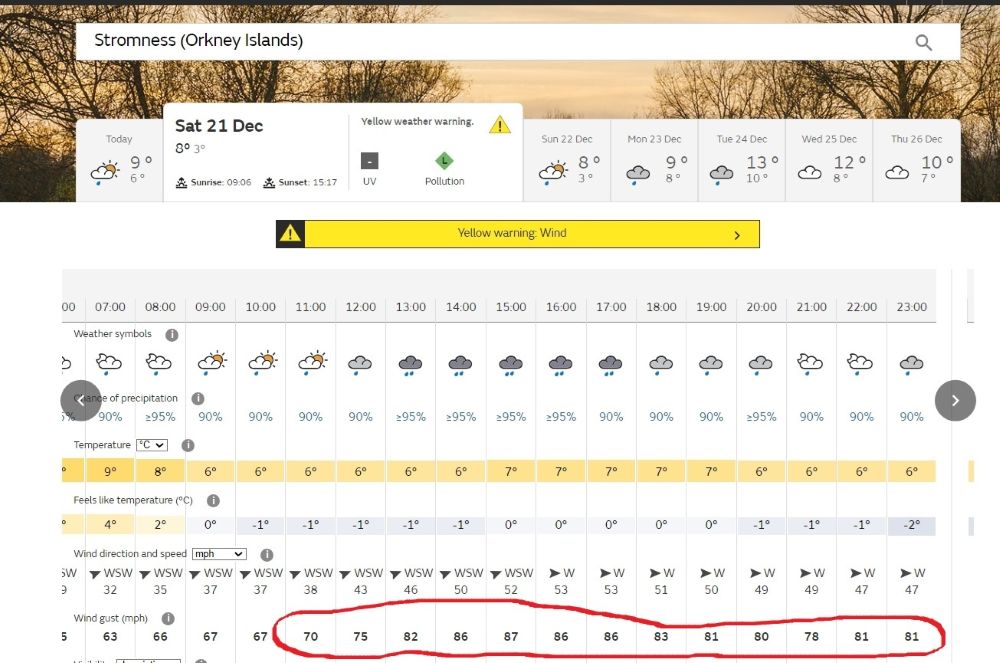 20th December – We are bracing ourselves for some wild winds tomorrow. Gusting up to nearly 87 mph, these are perhaps the strongest winds we’ve seen in Stromness since moving here.