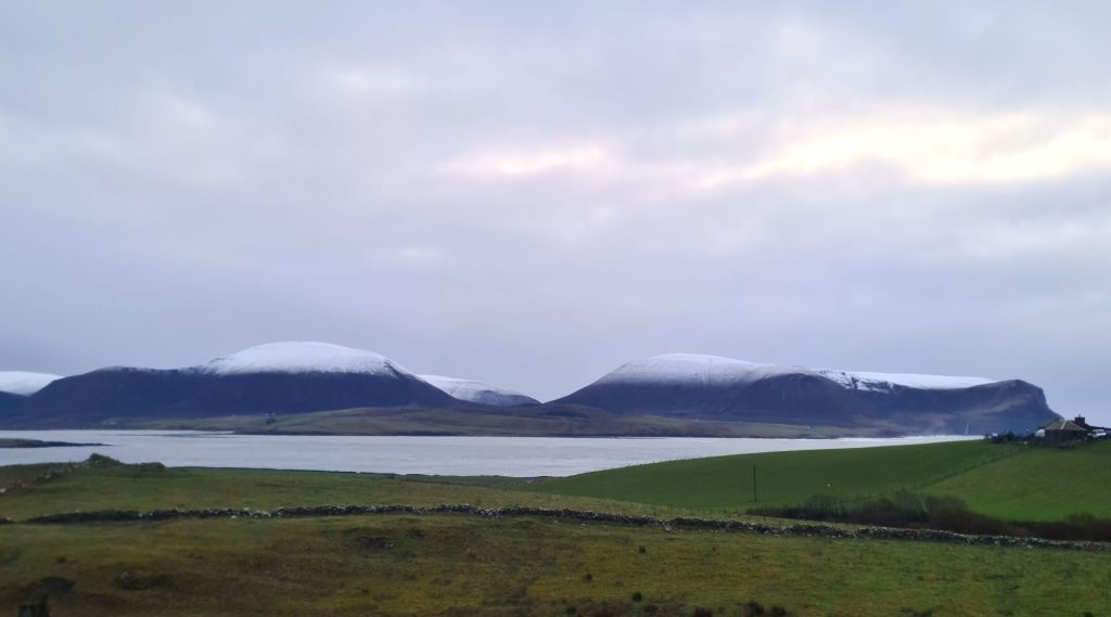 30th December – We have snow forecast for this coming week and the first has arrived on Hoy last night. The straight line effect clearly showing the altitude at which the temperature allows the snow to settle.