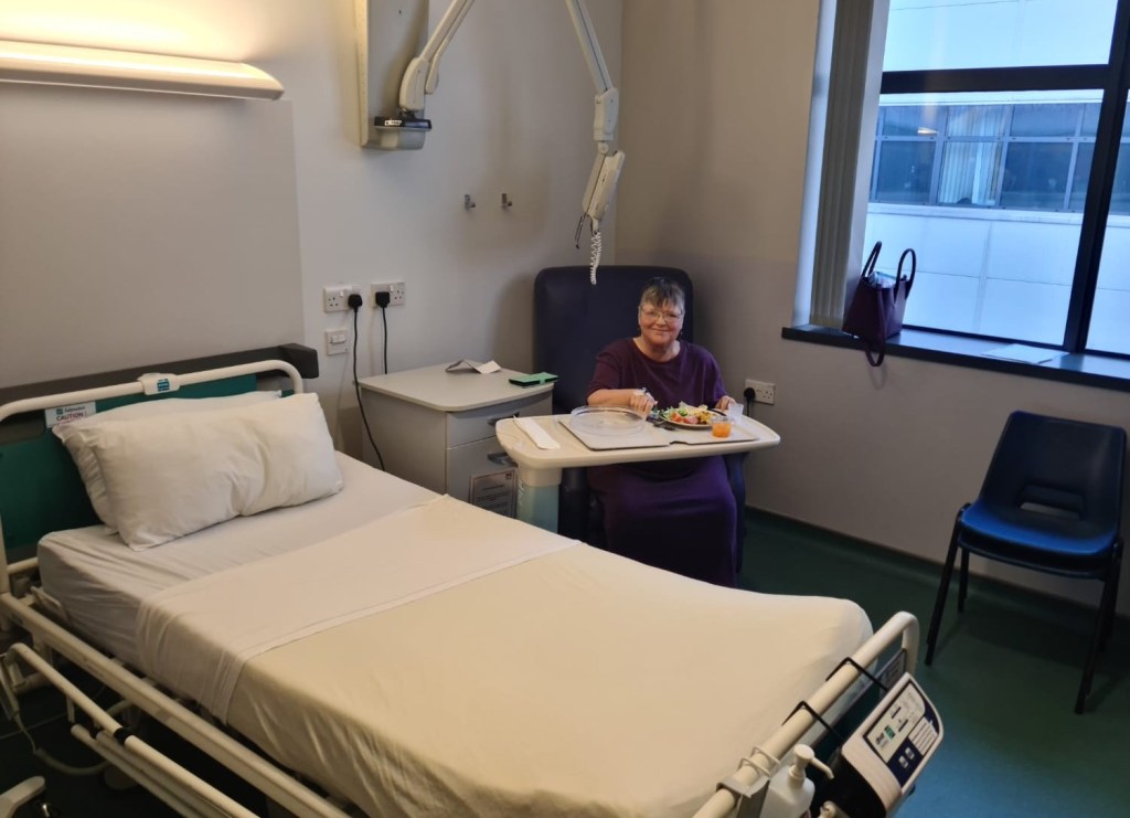 30th September – H has moved into her room in ARI and is still suffering from Lone Diner Syndrome. Note the blue plastic chair at lower right, it had the pleasure of my bottom for around forty hours!