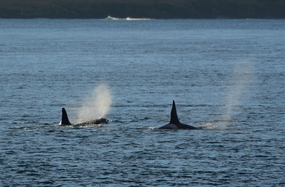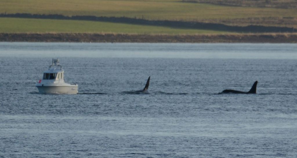 The day finished with a late phone call to say there were Orca heading towards Ness Point. So, with shoes untied, I dashed up to the Point just in time to catch them passing by.