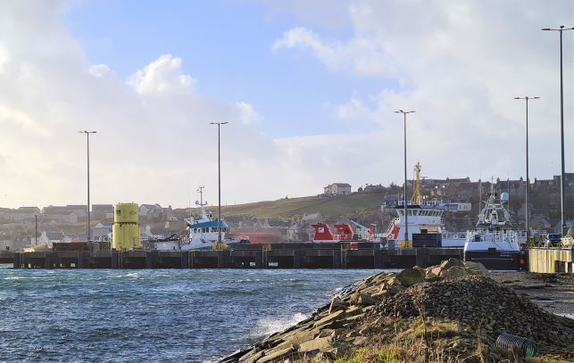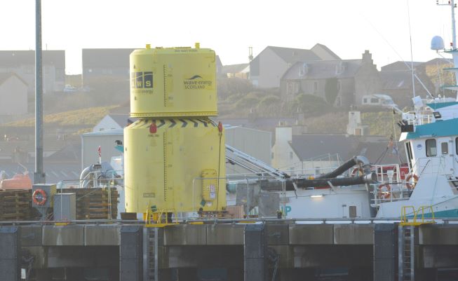 There’s a new arrival on the pier. The yellow cylindical thing is a 16kw ‘Archimedes Waveswing’ Wave Energy Converter that has been brought to Orkney for testing. It will be moored to the seabed and sit under the surface of the sea to react to changes in pressure caused by passing waves. The design enables it to continue to operate in rough sea conditions.