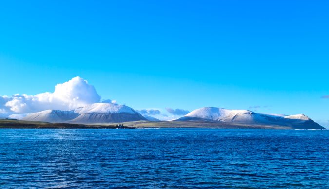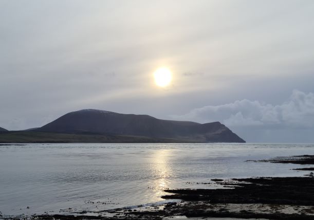 At this time of year, the sun never climbs very high in the sky and on a clear day it can be painfully blinding. This photo was taken about 1:30pm looking south to Hoy, the sun is barely above the hills.