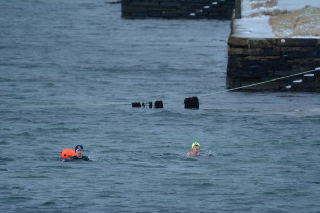 Hoy High appearing through the murk of the wintry showers. But the bitterly cold weather doesn’t deter the Stromness Polar Bears from taking a dip. Even with snow on the pier behind them. We can see on their faces how they are enjoying the delights of a refreshing swim.