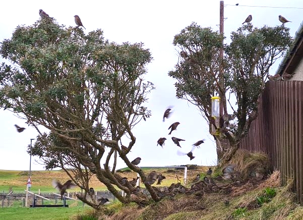 With the cold weather at the moment, we like to feed the birds. We don’t get a great variety of birds in the garden, mainly rooks, starlings and sparrows. But what we miss on variety, we make up for in quantity. This is a flock of sparrows attacking our seed dispenser. I reckon there are sixty five in this picture.