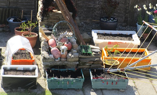 21st April – The good weather is continuing. We’ve filled another couple of old fish boxes and made a propagator out of two stationery boxes. H has made a couple of polythene covers to protect the bigger boxes.