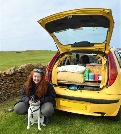 Well, we met her in the Stromness campsite today. It turns out that she is a doing an MA in botany at Uni in Edinburgh. She was on a budget tour of the Highlands and Islands and had converted her little car as, perhaps, the smallest camper ever.